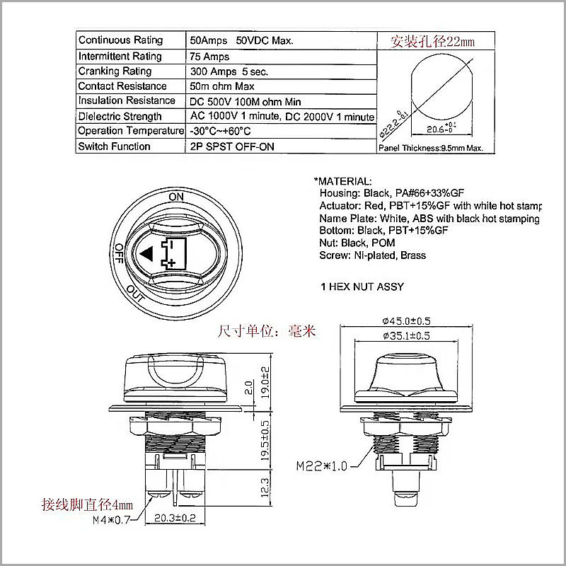 Specification of 32V 48V 50A 100A 200A SPST On Off Master Isolator Tractor Truck Battery Disconnect Switch