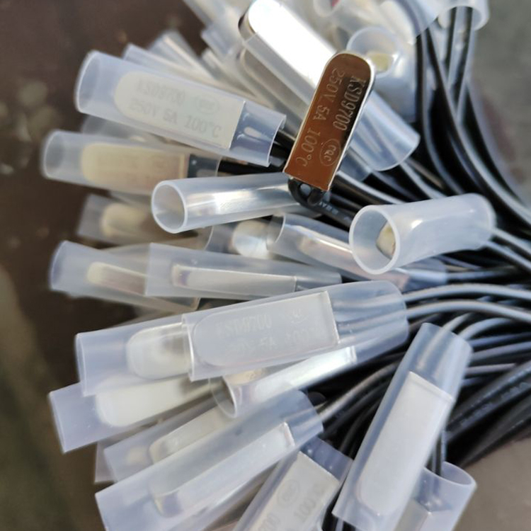 Ksd9700 series thermal protector consists of dish shape high sensitive bimetallic element,movable contact-head,static contact-piece,soleplate,outer case,ghermal resistant lead and so on. When operation,the bimetallic element is in free state and movable contact-head and static contact-piece are closed and the circuit is on.when the electric appliance is in operation is in operation and produces heat caused by some troubles and temperature is raised to the rated action temperature of the product,the bimetallic element produces inner stuess and acts quickly and pushes the movable contact-head and make the vontact point off and the power supply is rurned off the electric appliance stop.in this way the thermal protection is made. When the temperature of electric appliance to be protected is dropped to the rated reset temperature.the bimetallic element restores to its primary state and contact point is closed. The electric appliance restores its work. The product has many advantages such as small in resistor,quick in temperature feeling, fast in action, safe and reliable,compact and so on.